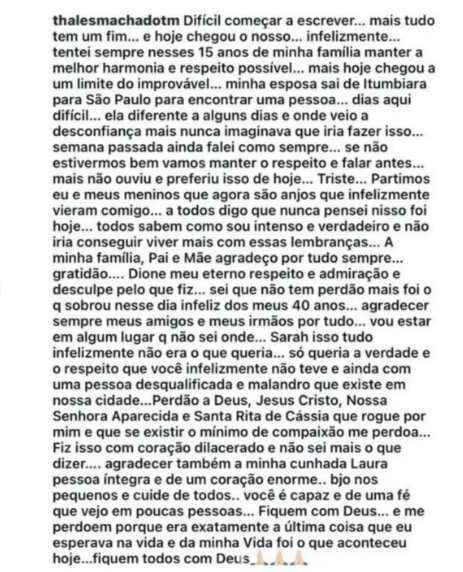 “thalesmachadotm Difícil começar a escrever… mais tudo tem um fim… e hoje chegou o nosso… infelizmente… tentei sempre nesses 15 anos de minha família manter a melhor harmonia e respeito possível… mais hoje chegou a um limite do improvável… minha esposa sai de Itumbiara para São Paulo para encontrar uma pessoa… dias aqui difícil… ela diferente a alguns dias e onde veio a desconfiança mais nunca imaginei que iria fazer isso… semana passada ainda falei como sempre…